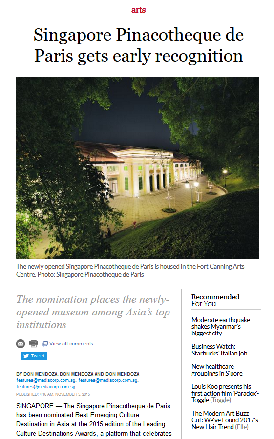 The Singapore Pinacotheque de Paris has been nominated Best Emerging Culture Destination in Asia at the 2015 edition of the Leading Culture Destinations Awards, a platform that celebrates the success of cultural institutions worldwide, while its 2015 edition also seeks to recognise emerging institutions across varied regions.