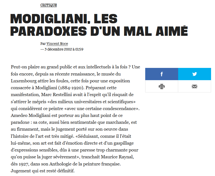 Peut-on plaire au grand public et aux intellectuels à la fois ? Une fois encore, depuis sa récente renaissance, le musée du Luxembourg attire les foules, cette fois pour une exposition consacrée à Modigliani (1884-1920). Préparant cette manifestation, Marc Restellini avait à l’esprit qu’il risquait de s’attirer le mépris «des milieux universitaires et scientifiques» qui considèrent ce peintre «avec une certaine condescendance». Amedeo Modigliani est porteur au plus haut point de ce paradoxe : sa cote, aussi bien sentimentale que marchande, est au firmament, mais le jugement porté sur son oeuvre dans l’histoire de l’art est très mitigé. «Séduisant, comme il l’était lui-même, son art est fait d’émotion directe et d’un gaspillage d’expressions sensibles, dûs à une paresse trop charmante pour qu’on puisse la juger sévèrement», tranchait Maurice Raynal, dès 1927, dans son Anthologie de la peinture française. Jugement qui est resté définitif.