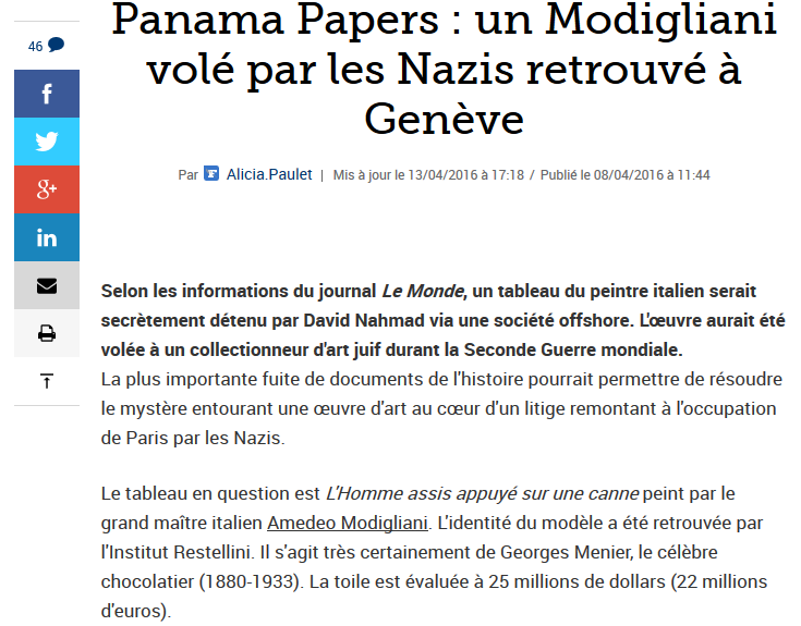 Le tableau en question est L’Homme assis appuyé sur une canne peint par le grand maître italien Amedeo Modigliani. L’identité du modèle a été retrouvée par l’Institut Restellini. Il s’agit très certainement de Georges Menier, le célèbre chocolatier (1880-1933). La toile est évaluée à 25 millions de dollars (22 millions d’euros).
