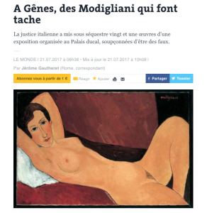 “C’est insensé : écoutez, plusieurs de ces toiles sont si horribles que je ne les accrocherais pas dans mon salon !” Le collectionneur toscan Carlo Pepi ne décolère pas. Depuis plusieurs mois, il alertait les autorités italiennes sur la présence de faux grossiers, placés au côté de chefs-d’œuvre venus des plus grands musées du monde, dans l’exposition Modigliani qui s’est ouverte le 16 mars au cœur du Palais ducal de Gênes.