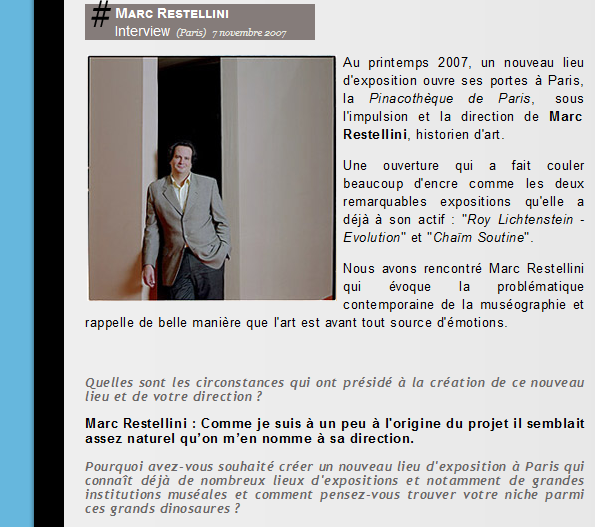 Au printemps 2007, un nouveau lieu d’exposition ouvre ses portes à Paris, la Pinacothèque de Paris, sous l’impulsion et la direction de Marc Restellini, historien d’art.